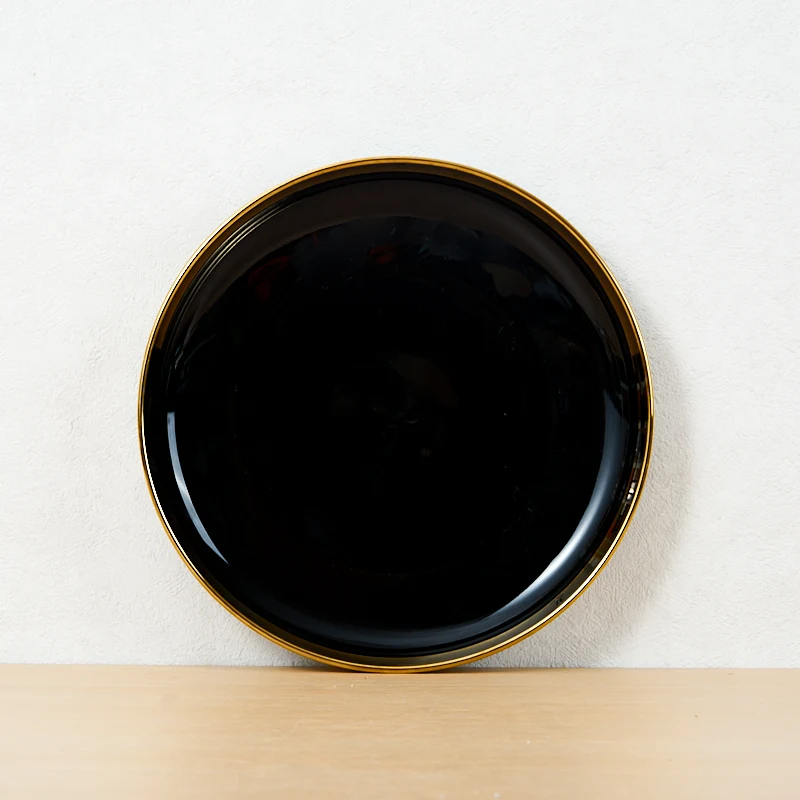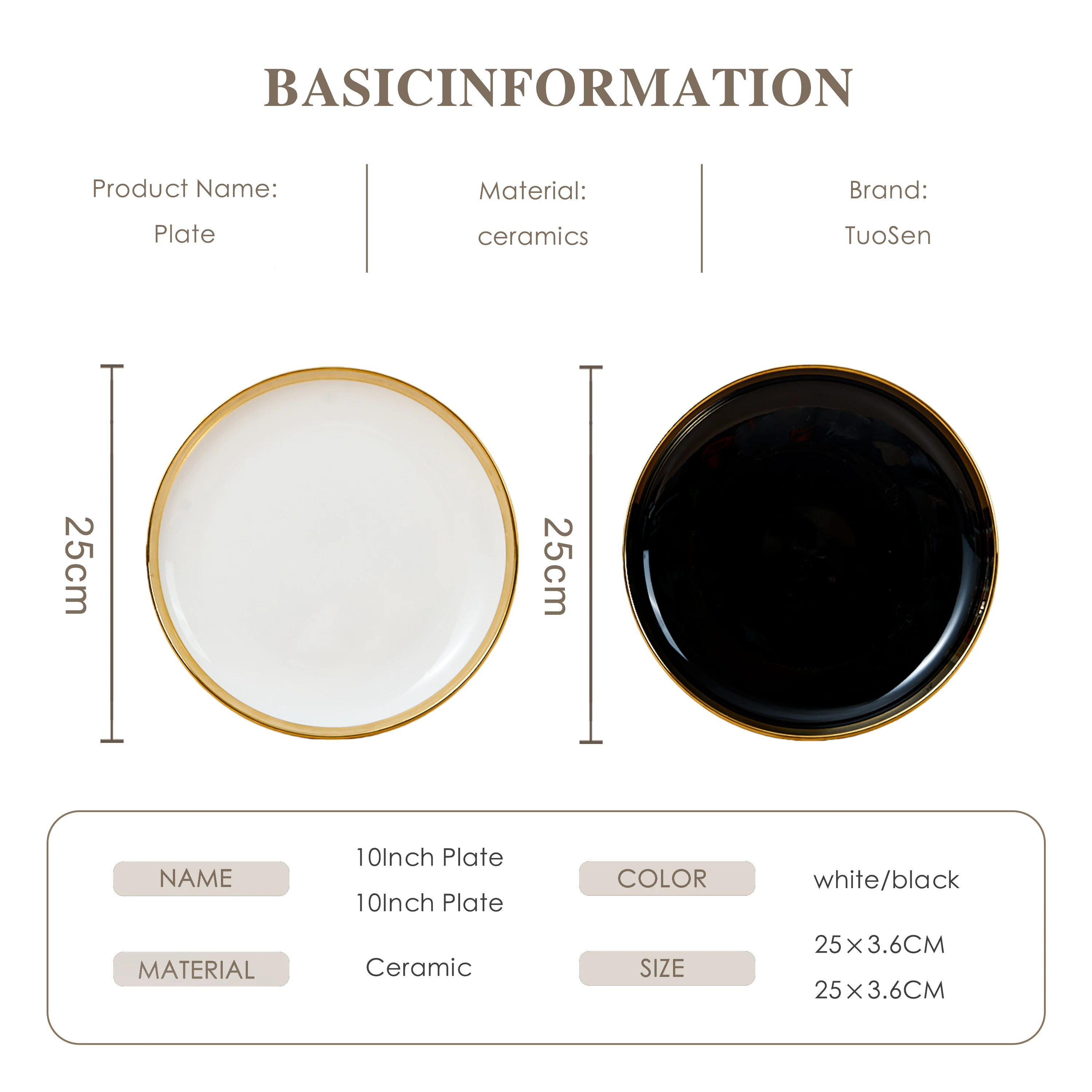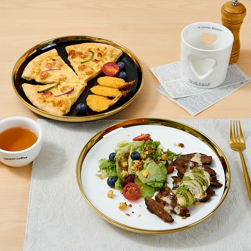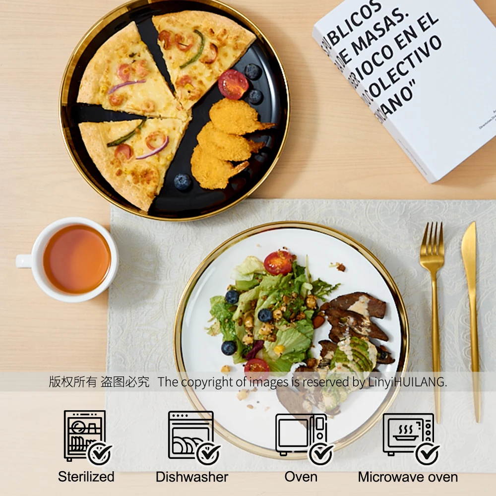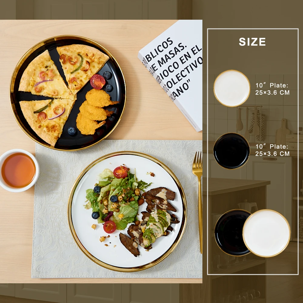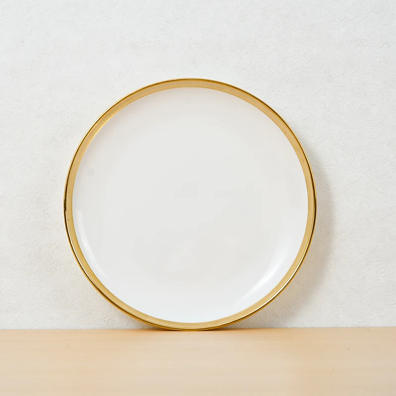 Tuosen moderní trvanlivé keramické jedny bílé barvy s pozlaceným okrajem a individuálním vzorem, vhodné jako talíře na svatbu nebo na pizzu