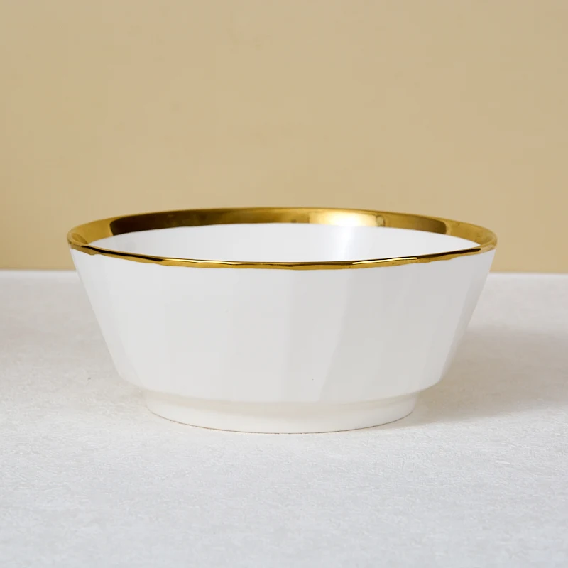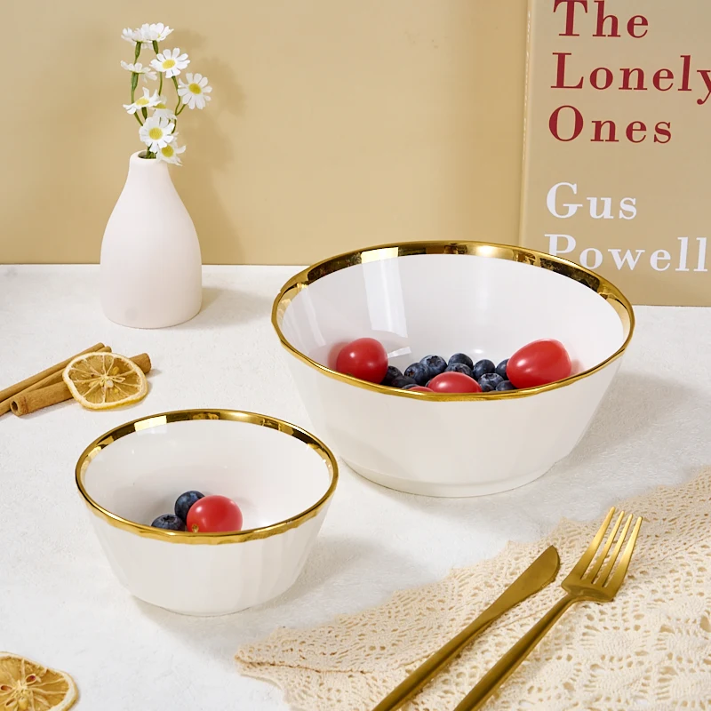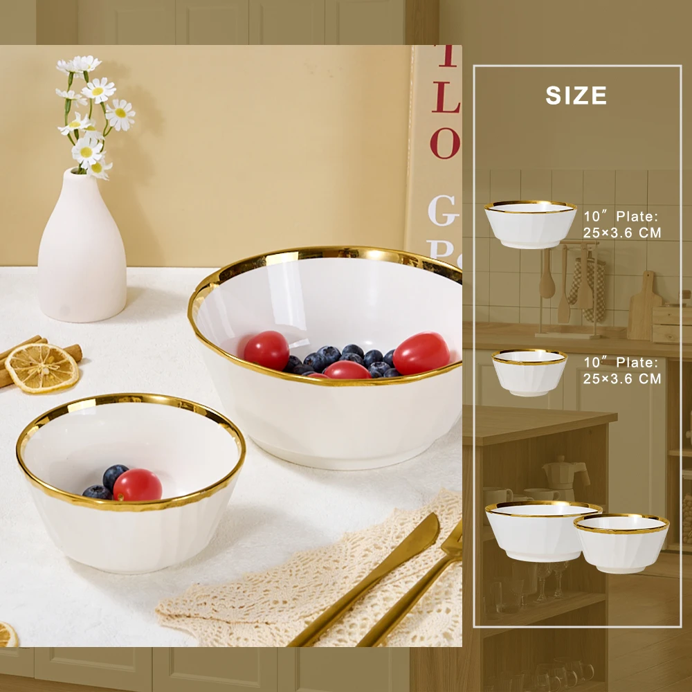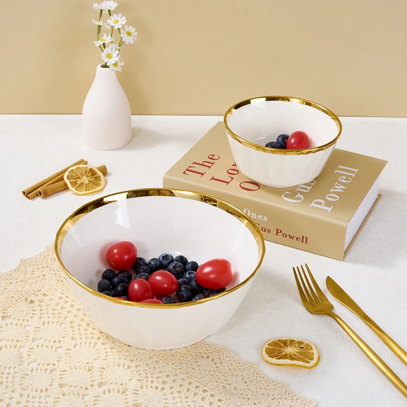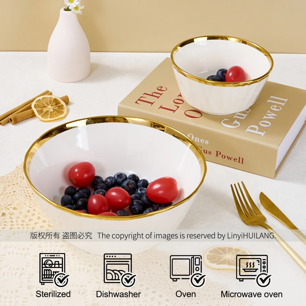 Sérsniðin merki porcelænshjónabands- og rísibollar með reljéfmynduðum punktamynstri, gullhringlaga, öruggt í diskvél og ofni