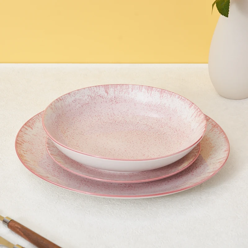 18-Piece Custom Packaged Pink Reactive Glazed Ceramic Dinnerware Set Full Collection Stone Ware Tableware Sample Available